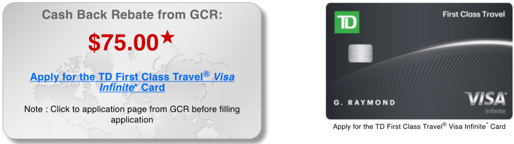 Also, the cash back website, Great Canadian Rebates (GCR) is offering a cash back bonus of $75 if you’re approved for the TD First Class Travel Visa Infinite Card!